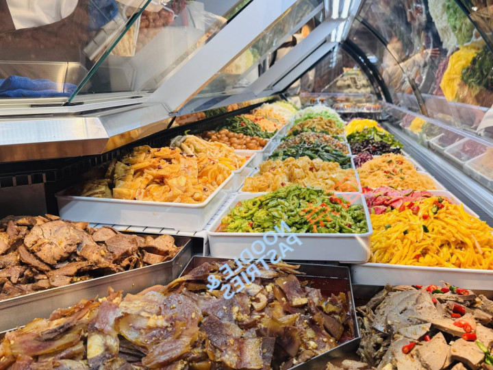 在生鲜板块,强化品质溯源与新鲜保障:安格斯牛肉、潮汕牛肉、本地肉禽同台竞技,梭子蟹捕捞上岸不到24小时就鲜活到店,在水产区与帝王蟹、乳山生蚝、三文鱼、黄瓜鱼等组成海鲜世界;新疆哈密瓜、西梅、吊干杏带着香气在72小时内跨越千里,与垆土铁棍山药、恩施小土豆、洪湖鲜藕带等一起摆上货架、端上泰安市民餐桌。熟食区成为亮点区域,汇集胖东来同款去骨猪蹄、小甜肠、牛肉干、韩式炸鸡等,还有北京烤鸭、土家鲜肉饼等多元风味,并引入圣都熟食、捞汁小海鲜等本土特色,同步推出现做山东煎饼等本地特色风味,方便市民与游客即买即食。烘焙区则与中粮等优质供应商合作,主打“丰收的喜悦”健康欧包、“核桃满满”乳酪面包等现烤产品,还有真实果肉的榴莲千层、超长“毛毛虫面包”香气浓郁、云朵般绵软湿润口感的山茶花山泉吐司,吸引大量顾客驻足。